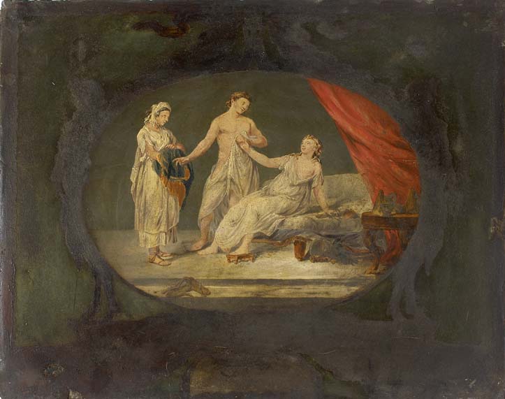possibly a souvenir from Pompeii, the rectangular slab painted with an oval medallion depicting a Classical Romanesque scene, in the manner of murals at Pompeii but of an 18th century date, within its original softwood packing case with iron loop handles