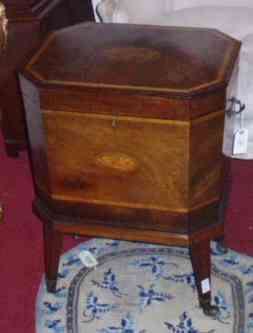 of tapering rectangular form with crossbanded and chequer strung sides decorated with shell paterae and brass carrying handles, on splayed square tapering legs ending in brass box castors