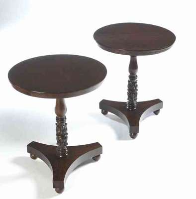the circular tops with baluster turned and lotus leaf carved column supports, raised on tripod bases with bun feet