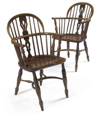 the spindle filled hoop backs with pierced splats above saddle seats, on ring turned and splayed tapering legs (6)