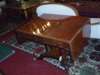 the rounded rectangular top with two cockbeaded frieze drawers opposed by simulated drawers, on a ring turned and reeded four pillar base with four out-splayed reeded sabre legs ending in anthemion cast brass caps and castors