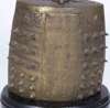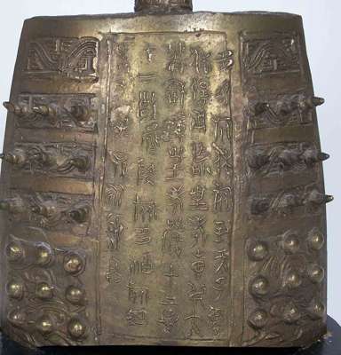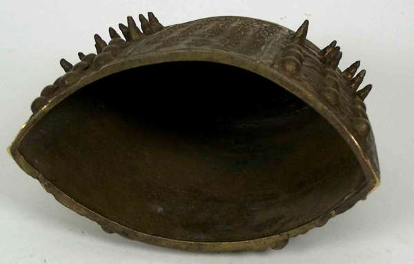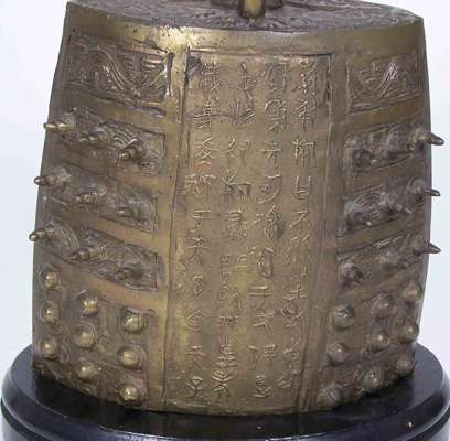with cylindrical handle above elliptical body decorated with character text to a central panel flanked by borders of spikes and bosses, on a stained wood stand