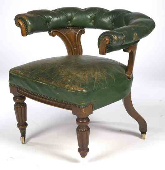 the button upholstered hide wrap around back rail on foliate carved supports above a bowed stuffover seat, on reeded tapering legs