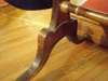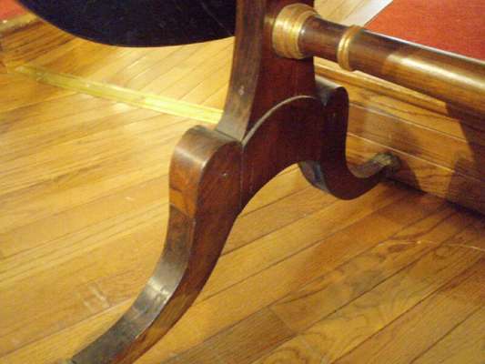the rounded rectangular top with two long drop leaves decorated with a leaf-scroll border above two frieze drawers and two simulated drawers with brass pull handles, between fleurs-de-lys capitals, the end standards of waisted form, on dual splay sabre legs headed by gilt metal rosettes and ending in lion paw cappings and castors