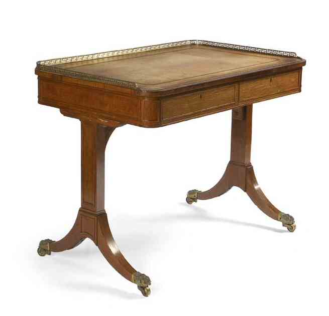 the rounded rectangular top with gilt tooled tan skiver and key fret pierced gilt metal three quarter gallery above a pair of sunken field frieze drawers, on similarly moulded end standards on dual splay sabre legs ending in brass paw caps and castors
