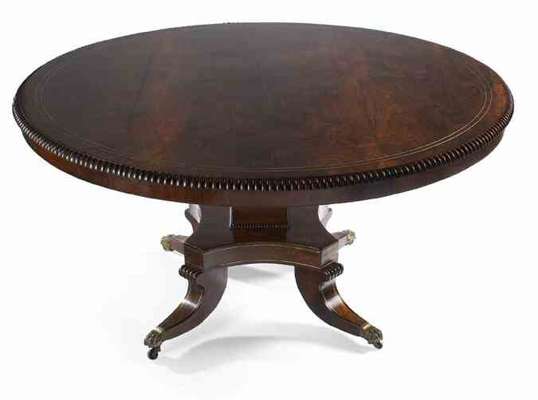 the circular top with gadrooned edge and plain frieze on a stepped and beaded square section pillar and concave platform base raised on four sabre legs ending in brass paw caps and castors