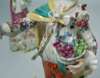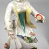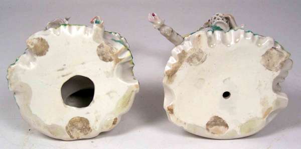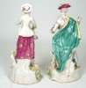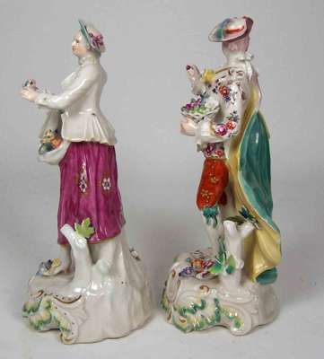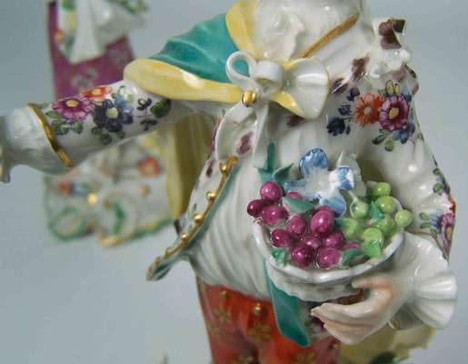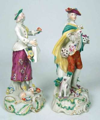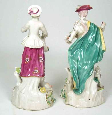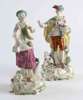 the woman collecting flowers in her apron wearing a white jacket and pink flower sprigged skirt, with a tree trunk and lamb at her feet, the man with a fruit basket, wearing a green and yellow cloak, a white polychrome flower sprigged coat and red gilt flower sprigged breeches, with a dog and a tree trunk by his feet, both on a rococo base (2)