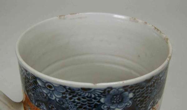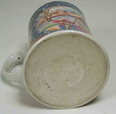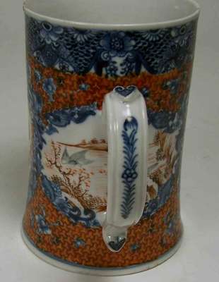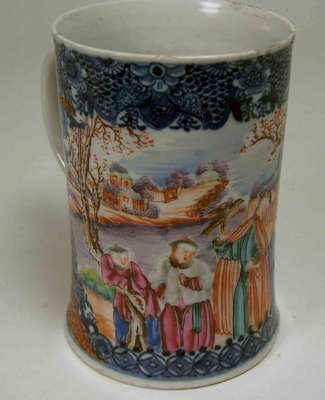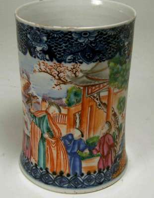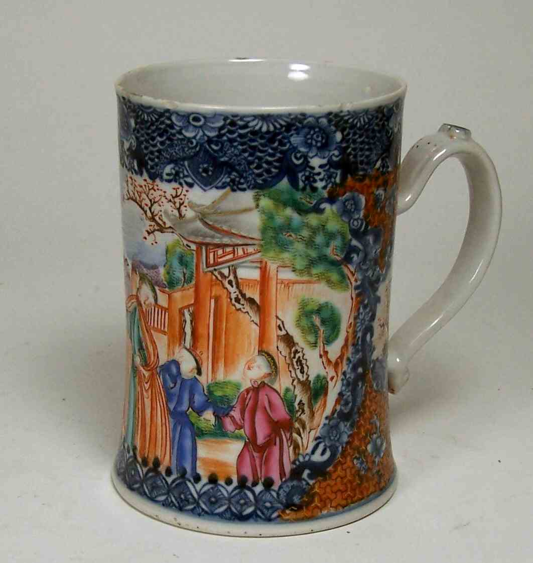 decorated in the Mandarin palette with figures in a landscape with pagoda behind. with underglaze blue border