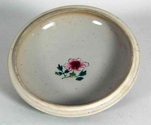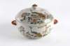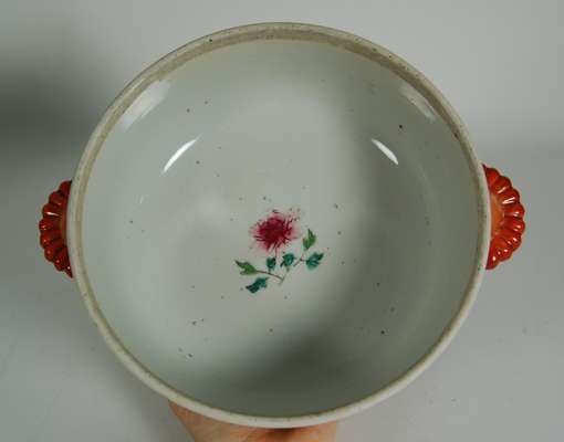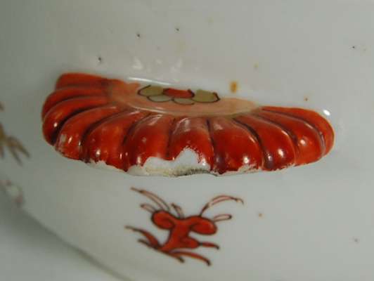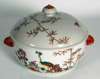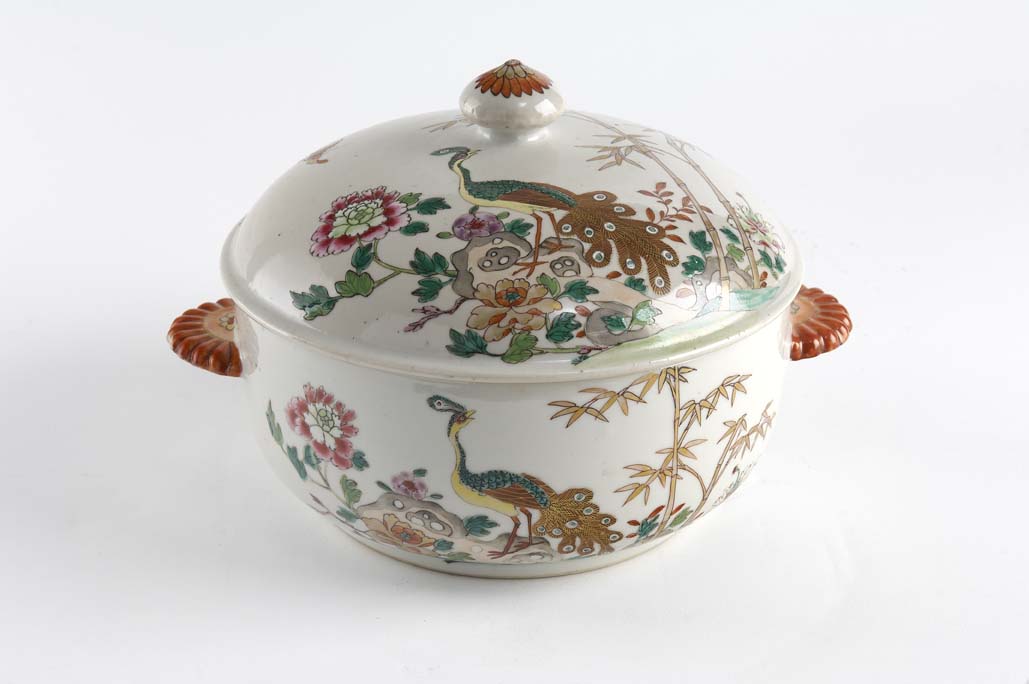 the knop painted with an iron-red chrysanthemum head, the handles in the form of shells, the cover and body painted with peacocks, peonies, rockwork and gilt bamboo