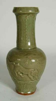 with flared rim above elongated neck and ovoid body, with moulded decoration, the neck with stiff leaves, the body with a dragon and a tiger, with flowers and scrolling foliage