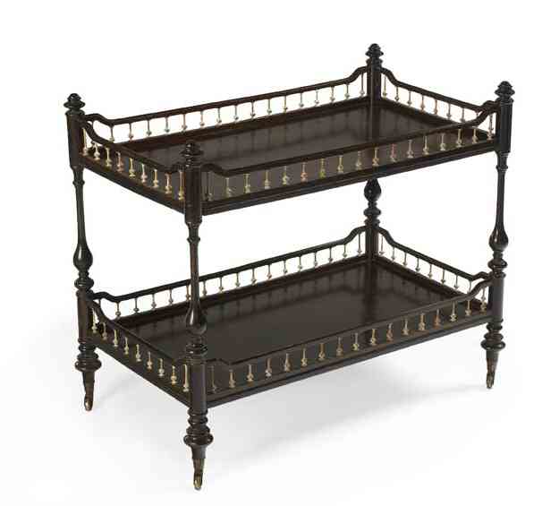 the two rectangular galleried tiers with painted spindles, raised on baluster turned supports terminating in brass cappings and castors