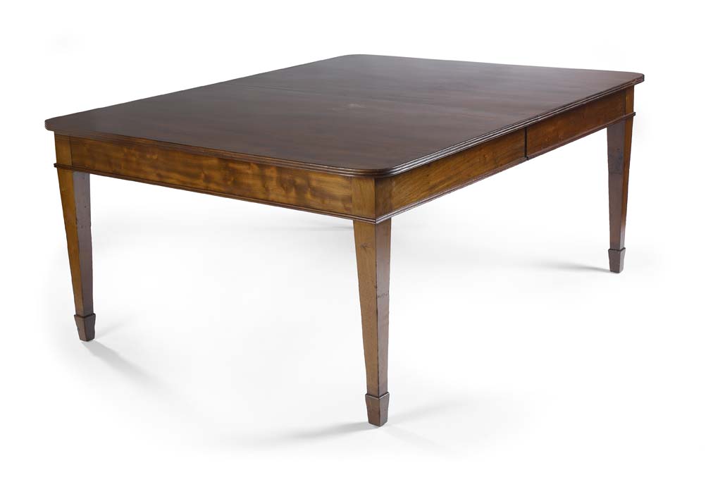 the rectangular top with three additional leaves and a reeded edge above a plain frieze with reeded lip, on four square tapering legs ending in spade feet, the sliding rails stamped...........