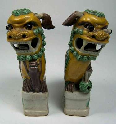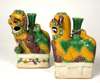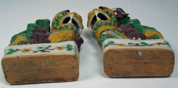 each in the form of an joss stick holder, and with babies crawling over its back, with detachable antlers and eyes, painted in green, yellow and brown, on a rectangular plinth decorated with blossom branch (2)