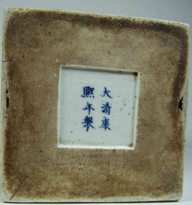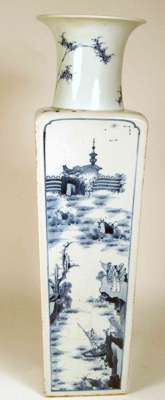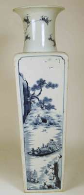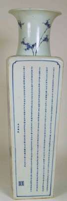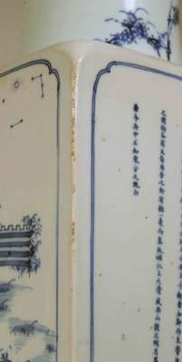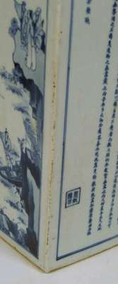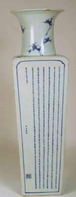 with flared neck and square tapered body, the neck decorated with bamboo, two sides decorated with the two 'Odes to the Red Cliff' by the Song poet Su Dongpo (1037 - 1096) , two sides with finely painted landscapes, unglazed foot rim with glazed recess bearing six character Kangxi mark