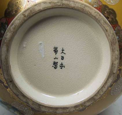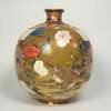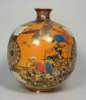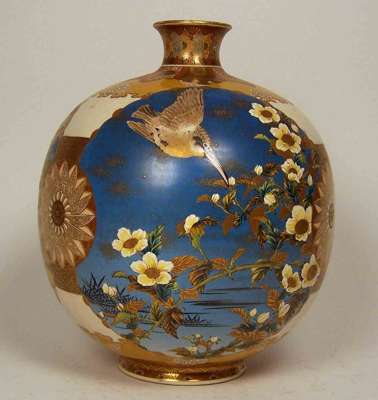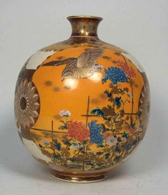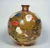 of globular form, decorated with overlapping panels of green, orange and blue, enamelled in polychrome and gilt birds and flowers, black painted signature