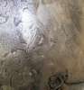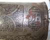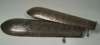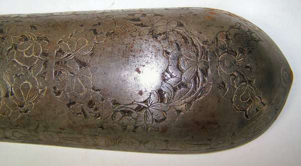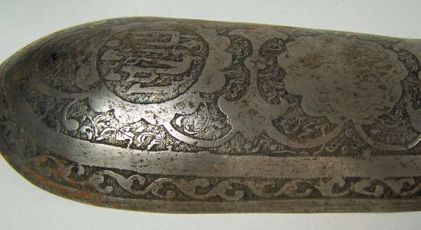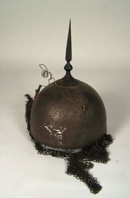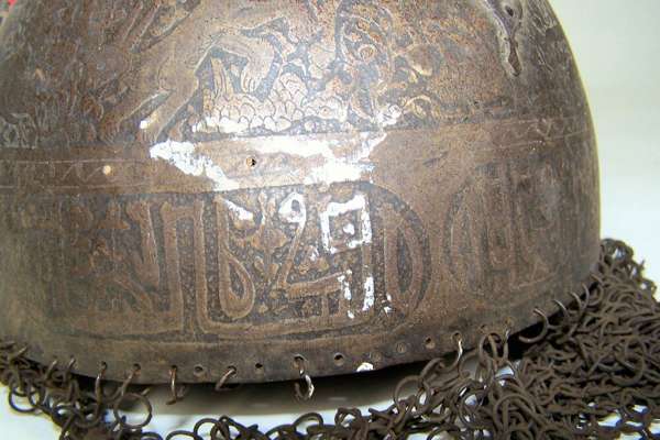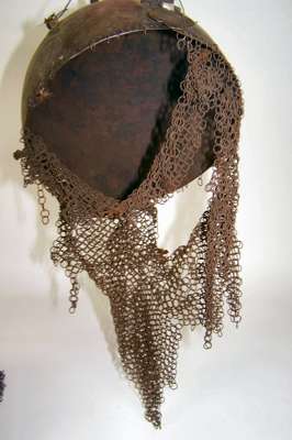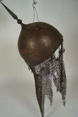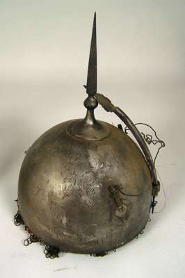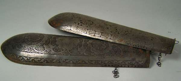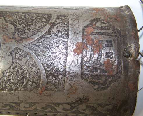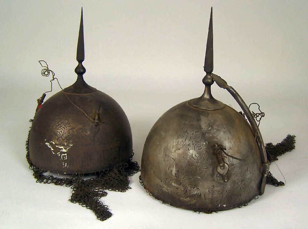 with centre spike, chain mail neck piece, the sliding nasal-guard flanked by plume holders, the sculls etched with hunting scenes and retaining its original liner, 35.5cm high; another similar (lacking nasal guard and lining) the scull partly over cleaned; together with two elbow guards (4)