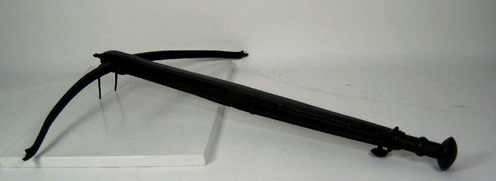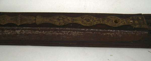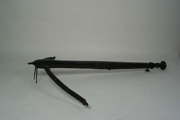 the hardwood tiller inset with an engraved brass strenghtening piece, turned iron pommel and with iron bow
