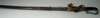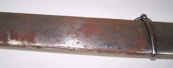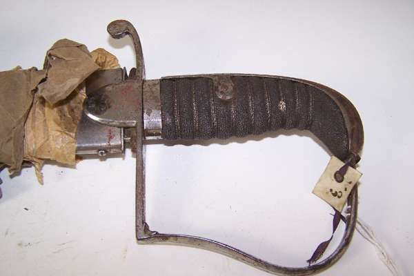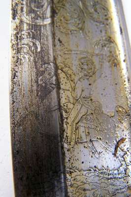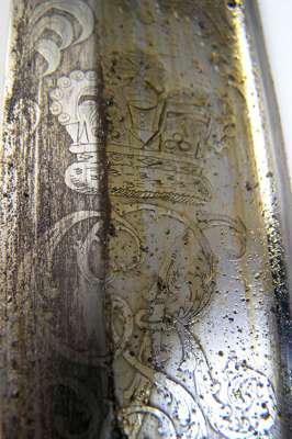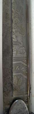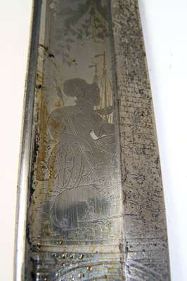 pattern 1796 with stirrup hilt with faceted back strap, multi faceted ferrule, short shield shaped langets the wooden grip covered in black dogfish bound with a double twist of silver wire, the single edged except for the last 10 inches of the point single broad fuller, curved pipe back sabre blade entirely covered on both sides with decorative classical motifs, in its original wrought iron scabbard with loose rings