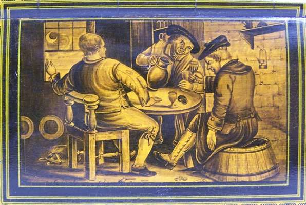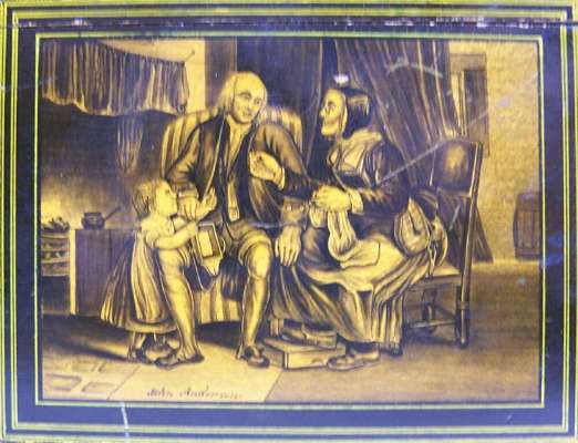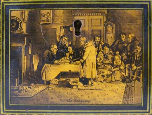The hinged lid decorated with a scene depicting figures fishing beside a bridge, the sides decorated with rectangular reserves entitled 'John Anderson', 'Rent Day' and 'Tom O'Shanty' against a basket weave ground