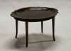 the serpentine shaped oval tray painted with a band of scrolling foliage, raised on square tapered slightly splayed legs