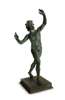 with arms raised aloft, on a moulded rectangular plinth base, verdigris patination