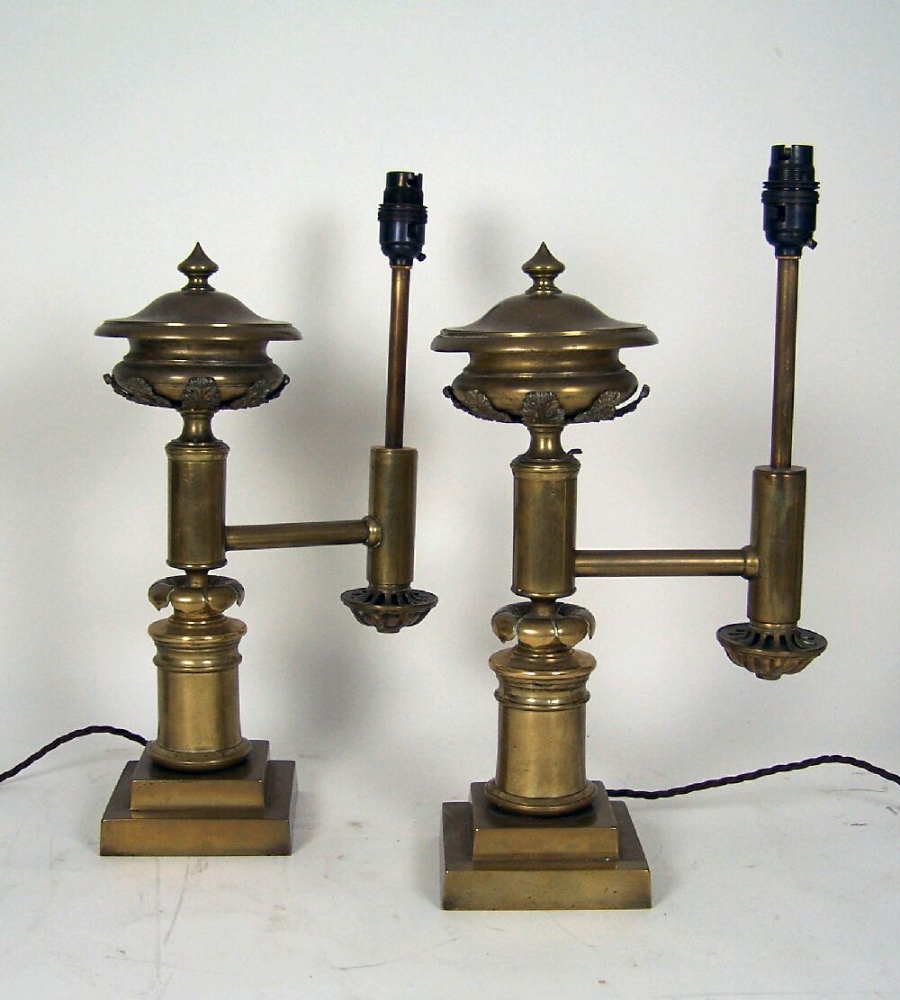 of typical form, surmounted by urns with applied acanthus ornament, fitted for electricity