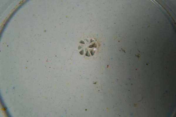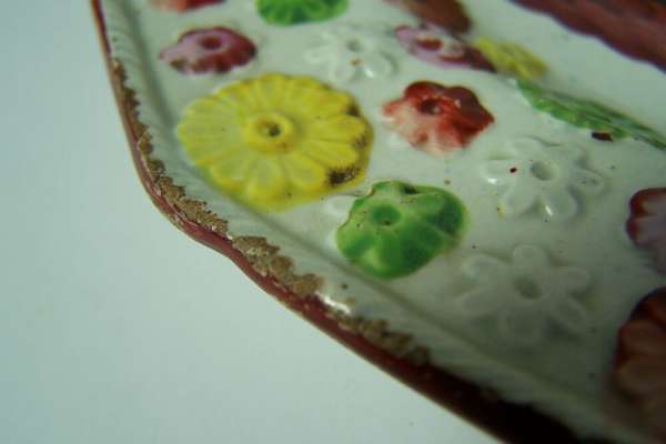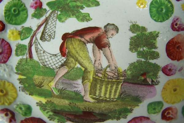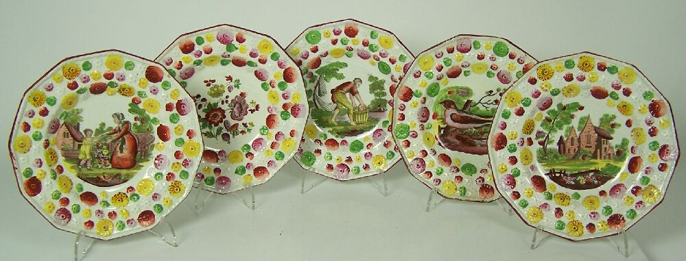each of twelve-sided form, with moulded polychrome flowerheads to the border, the well with printed and hand coloured decoration depicting: a fisherman, a bird, flowers, a mother and child, and a building (5)
