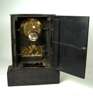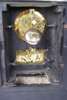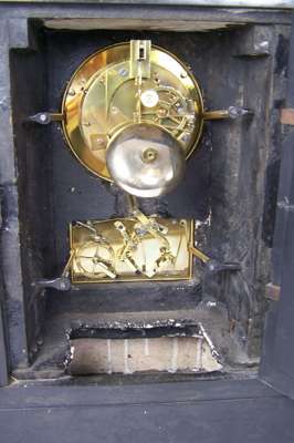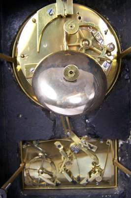 the canted rectangular case with a white enamel dial over a second dial for date/day and month, the twin train barrel movement striking on a bell