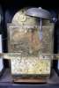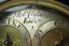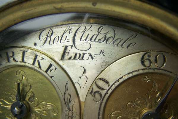 the gilt dial signed Robert Clidsdale, Edinburgh, with silvered chapter ring, date aperture and two subsidiary dials for silent strike and seconds, the twin train fusee movement with foliate engraved back plate and striking on a bell, the arched case with a brass carrying handle, moulded apron and raised on bracket feet