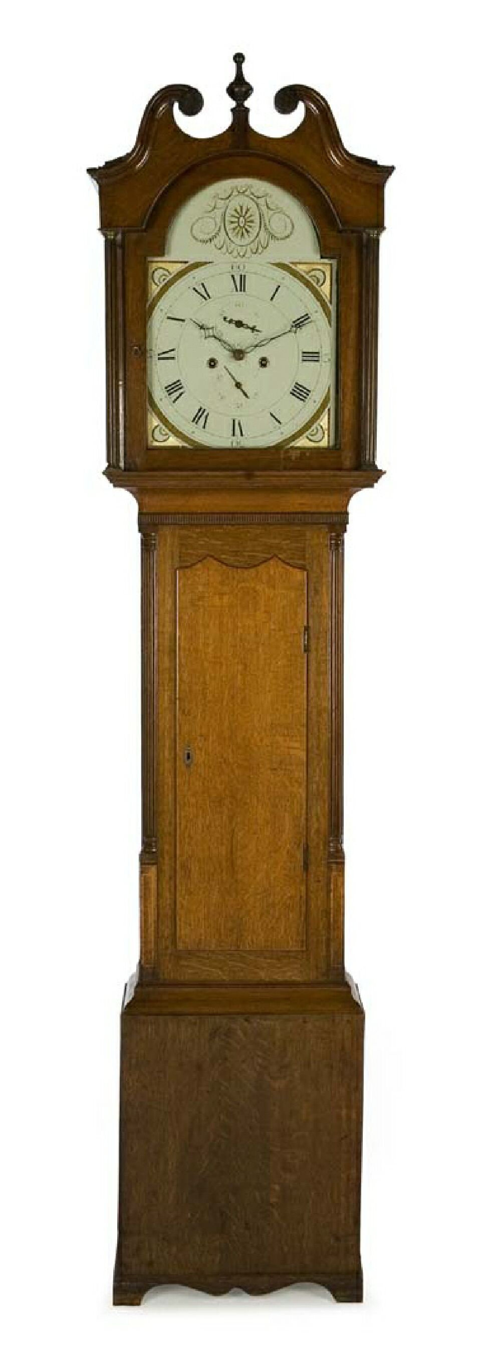 the twin train movement with anchor escapement striking the hours on a bell, the swan-neck pediment with turned finial above simulated 'verre eglomise' enamelled Roman dial with subsidiary seconds and calendar dials flanked by gilt fan spandrels and a swagged patera to the arch, the scalloped trunk door between reeded quadrant corners, on panelled base, on shaped apron and bracket feet
