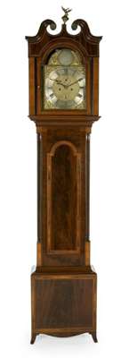 the twin train movement striking the hours on a bell, the swan-neck pediment with eagle finial and brass rosettes above a rococo cast brass dial with silvered Roman and Arabic chapters, subsidiary seconds dial and calendar aperture above spirally reeded quadrant corners and an arched trunk door, on panelled base with splayed bracket feet