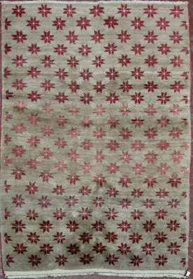 the grey field with allover red rosette and sea green leaf lattice pattern