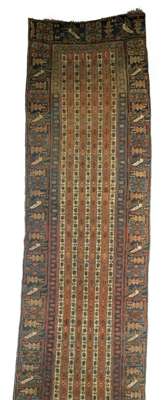 the field with 'cane' pattern of vertical stripes in madder and ivory enclosing boteh and stylised flowerheads, within a main polychrome border of boldly drawn rosettes linked by angular vines