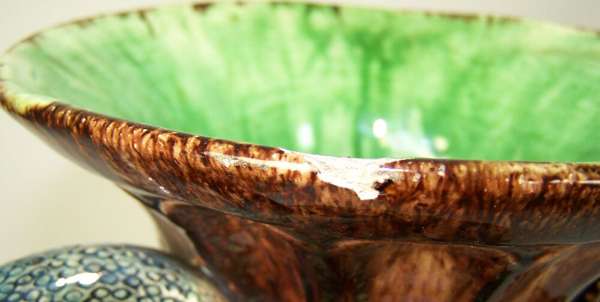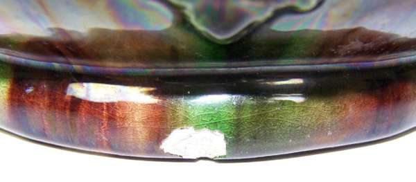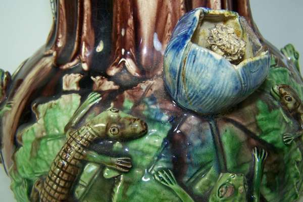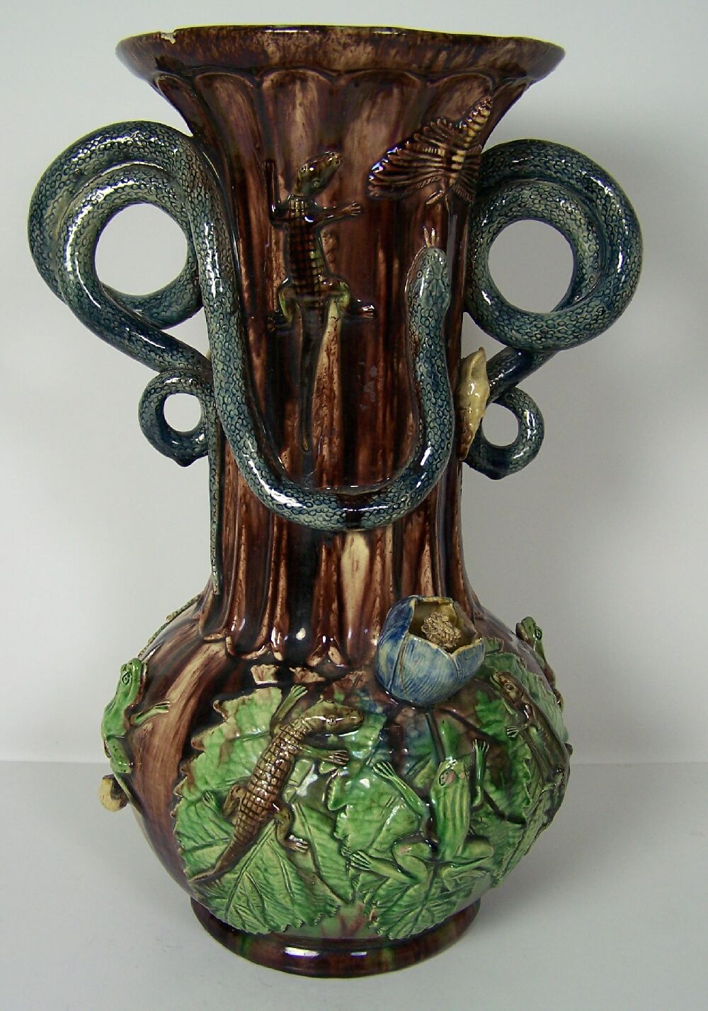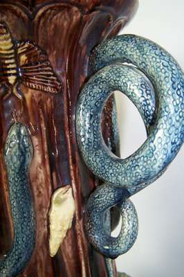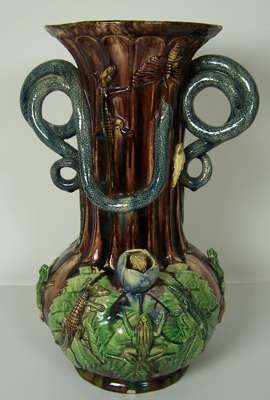 with flared rim and elongated neck above globular body, the handles in the form of serpents, the body applied with lizards, frogs, shells and flowers, impressed mark
