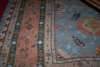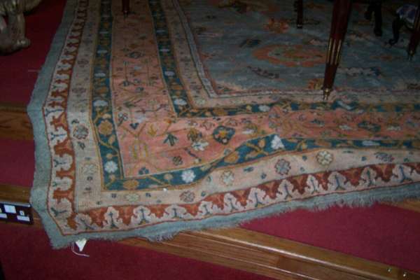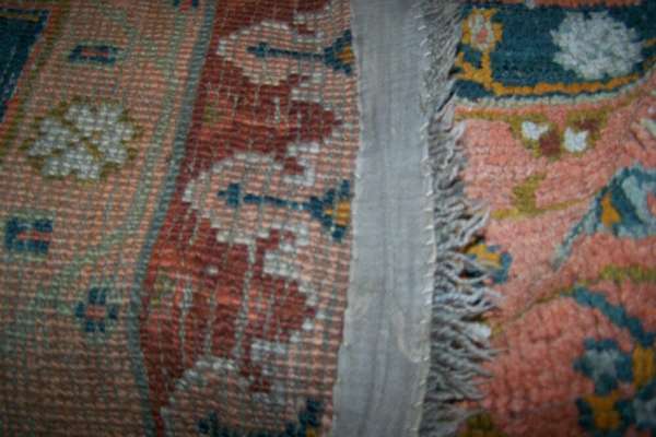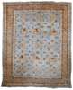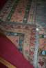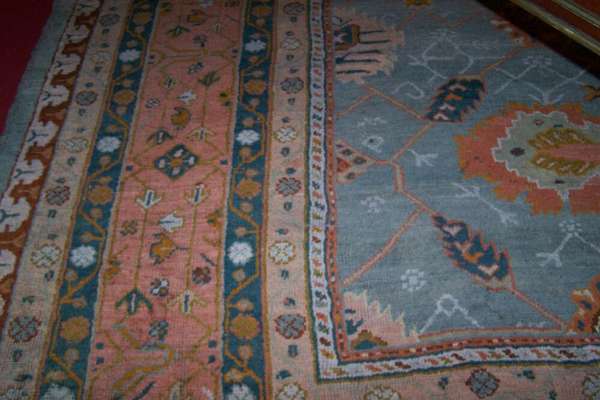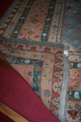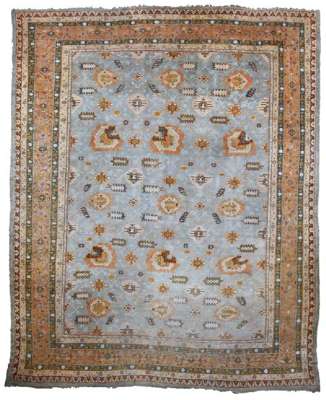 the slate blue field with allover stylised palmette and foliate angular lattice pattern, within salmon small rosette, tulip and stylised vine border between blue, pink and brown bands