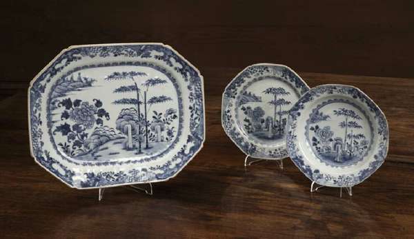 decorated with a stylised landscape including large flowerhead, tall bamboo and rockwork, comprising: two octagonal ashets, 38cm wide, five bowls, and two plates (9)