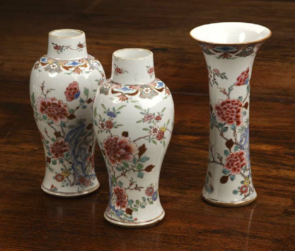 decorated with bold flowerheads and rockwork, comprising a pair of slender baluster form, 23cm high, the other trumpet shaped, 25cm high (3)