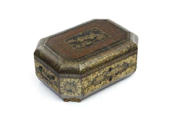 of octagonal form, decorated throughout with chinoiserie motifs, scrolls and narrative panels, the hinged lid enclosing a compartmented removable tray with various compartmented drawers with central hinged narrative panel (faults)