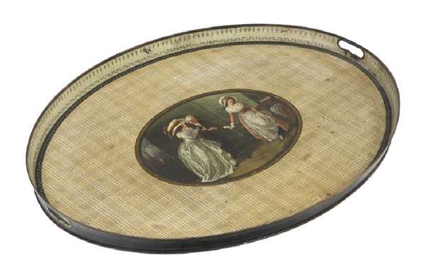 of oval form with pierced side handles, the bellflower decorated gallery enclosing a central oval interior scene of a gentleman and lady with a serving girl, within a tartan pattern surround