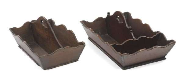 with scalloped edges and pierced carrying handle, 45cm long; also another George III period mahogany example, with ogee arched sides and pierced handle, 38cm long (2)