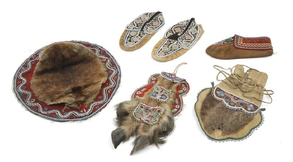 comprising: an oval purse, with central beavers panel, scrolling beadwork frieze, 42cm long; a caribou mounted panel, with applied beadwork pouches, 37cm long; a chamois purse, with opposed beadwork and skin panels, 31cm long; a purse with opposed beadwork and skin panels, 31cm long; a pair of moccasin shoes, with floral beadwork collar and tongue; and another similar plainer (6)