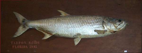 mounted on a brown painted wooden board, lettered ‘Tarpon 85lbs Florida 1893’