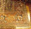 the indigo field with allover herati pattern, within rose turtle palmette and foliate border between rose and ivory bands