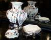 the baluster sides and domed covers decorated in the typical Imari palette, raised on hexagonal bases raised on scroll feet, painted red E and anchor marks