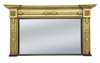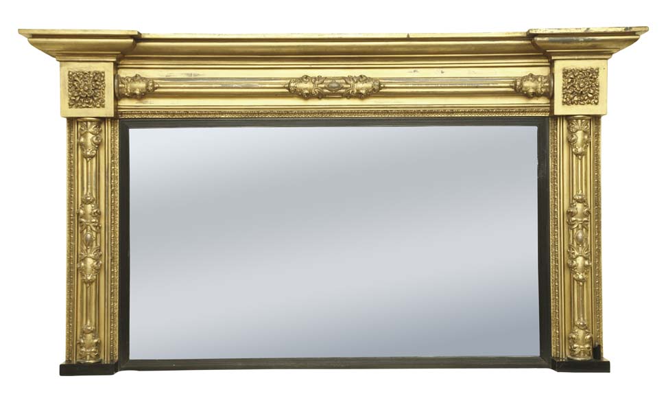 the inverted breakfront stepped moulded cornice above a reeded and scroll cartouche applied pilasters and mirror plate within ebonised reeded slip, flanked by conforming pilasters headed by square foliate paterae