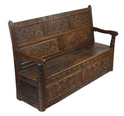 the top rail carved ‘R 1734 M’, above five double heart and foliate carved panels, the open arms above a hinged seat and two rounded carved front panes (alterations)