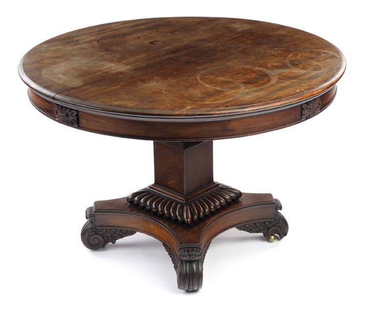 the circular moulded top on a stepped square stem with a gadrooned collar, the concave quatreform base with leaf scroll carved feet and concealed brass castors