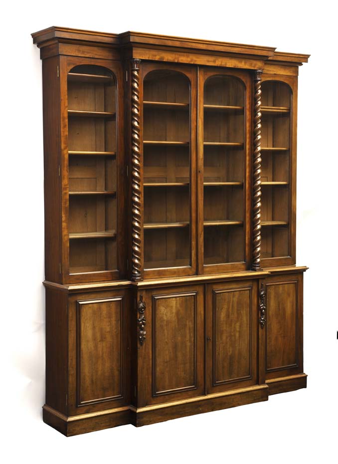 the stepped moulded cornice above a pair of glazed panel doors enclosing adjustable shelves, flanked by tapered spiral turned columns and containing outer doors, the pair of central lower moulded cupboard doors flanked by two further doors, on a moulded plinth base