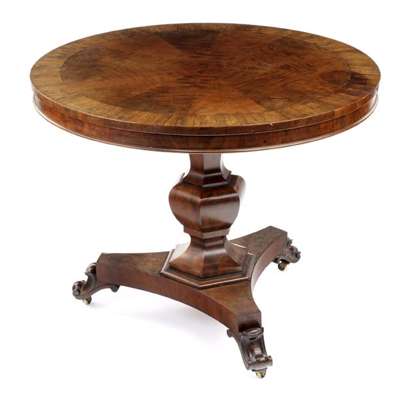 the radial veneered and rosewood crossbanded top on a hexagonal waisted baluster column, the triform concave base with scroll feet and castors