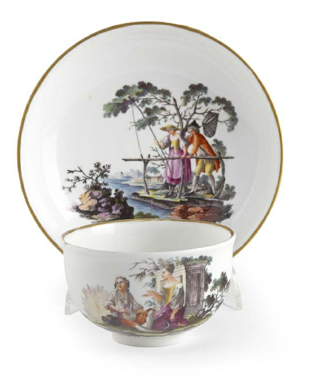 both with gilt rims, the cup decorated with a couple sitting in front of ruins, the saucer with a couple fishing in a classical landscape, underglaze blue cross mark